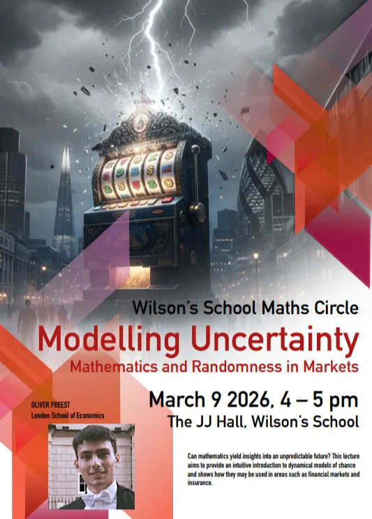 The first talk will take place on 9 March, with Oliver Preest (OW 2021 - now studying at the London School of Economics) delivering a talk titled 'Modelling Uncertainty: Mathematics and Randomness in Markets'. Preest will ask whether mathematics can yield insights into an unpredictable future, aiming to provide an introduction to dynamical models of chance and show how they may be used in areas such as financial markets and insurance.